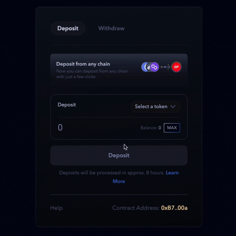 Select the asset from the supported chain and enter the amount to deposit.