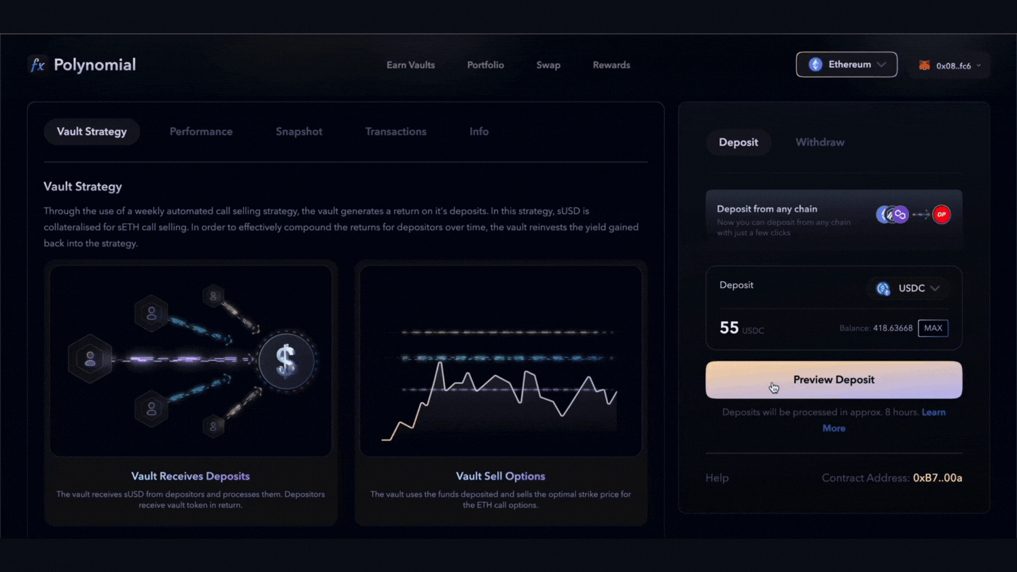 Users can deposit assets from any EVM chain into the polynomial earn vaults. Under the hood, this asset is bridged via Hop or Optimism bridge to Optimism using Socket. After which, this asset is converted automatically to the asset used in the vault and deposited into the vault. Assets supported are stable pairs and are converted using Curve.